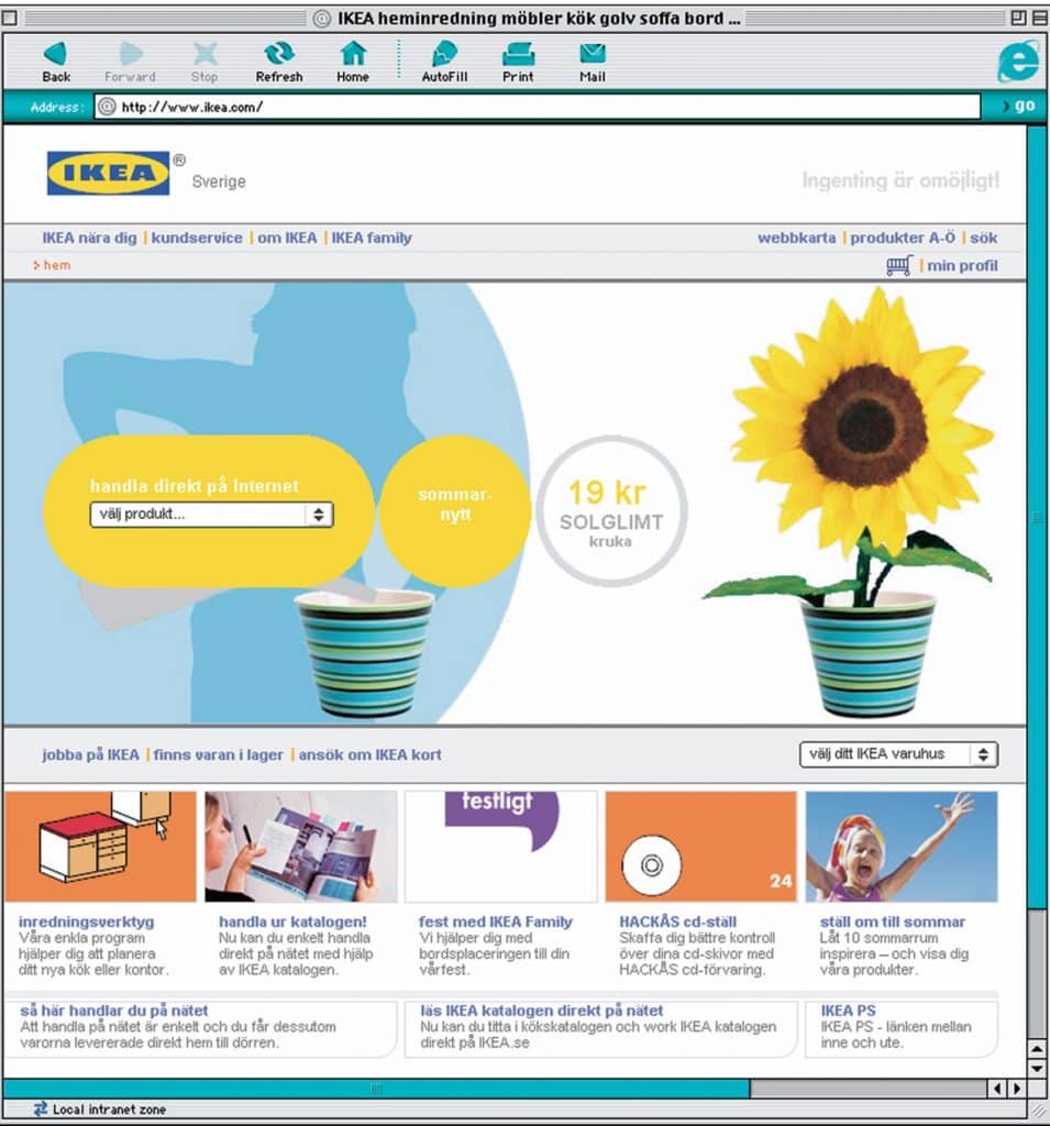 Ikea var faktiskt relativt tidiga med att ta steget ut på nätet. 1997 lanserades den första webbsidan, Ikea.se, på vilken kunderna bland annat kunde se produktbilder och lagersaldon.