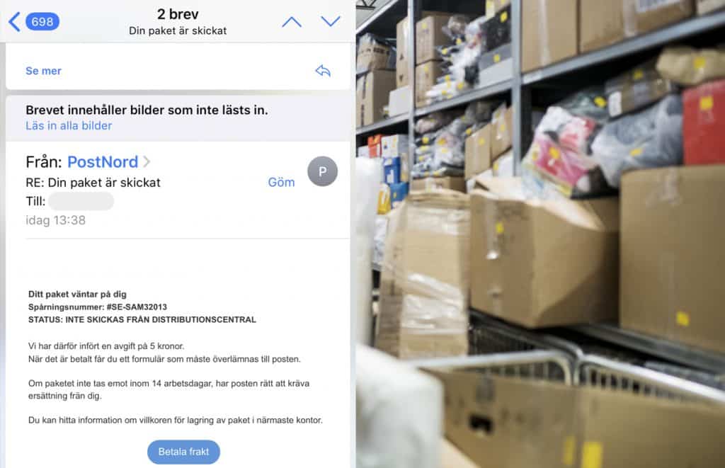 Betala fem kronor så får du ett formulär som kan lämnas till posten i utbyte mot ett paket som ligger där och väntar på dig. Ungefär så lyder budskapet i ett mejl som har skickats ut till ett okänt antal mottagare de senaste dagarna. Mejlet ser ut att ha PostNord som avsändare, men problemet är att både det och mejlets innehåll är påhittat av bedragare.
