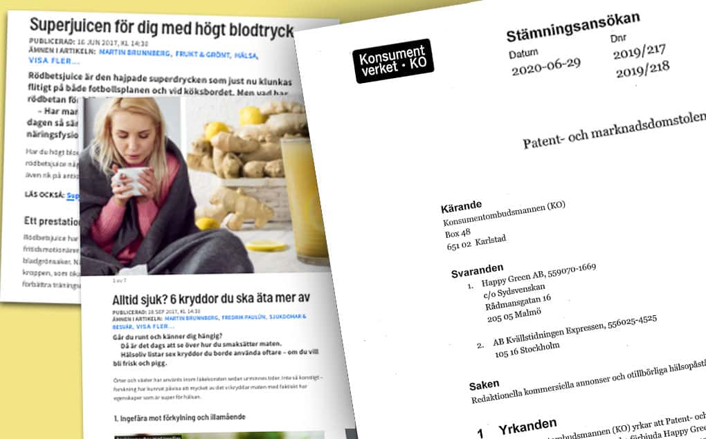 Happy Green och Expressen har på www.expressen.se låtit publicera två artiklar om rödbetsjuice och sex olika kryddors hälsofördelar och förmåga att förebygga, lindra och bota olika sjukdomar, såsom cancer, hjärt- och kärlsjukdomar, IBS, stroke och huvudvärk. De båda artiklarna har varit redaktionellt utformade, trots att artiklarna haft ett kommersiellt syfte och rent kommersiella förhållanden till föremål, skriver KO i ansökan.