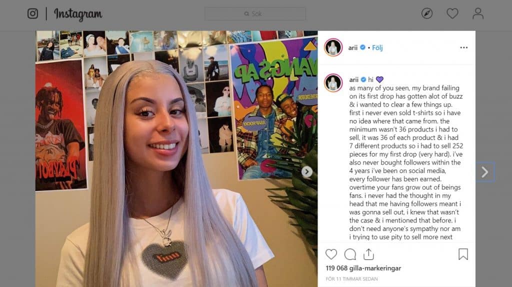 Enligt uppgift skulle influencern, en 18-åring från Florida som kallar sig Arii, starta ett nytt modevarumärke och företaget hon skulle samarbeta med krävde att ett första släpp på 36 tröjor skulle säljas innan fler exemplar trycktes upp. I ett senare inlägg på Instagram framför dock Arii att det i själva verket handlade om minst 36 exemplar av varje produkt.