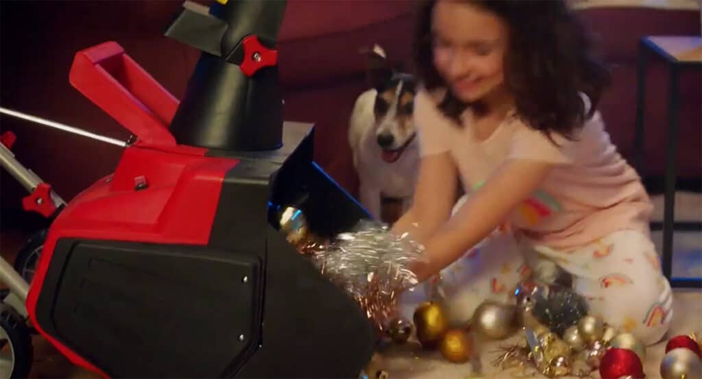 I nästa scen syns tomten stå vid en snöslunga i vardagsrummet. Medan hunden leker med några julkulor som ligger på golvet lassar flickan, påhejad av tomten, in julpynt i snöslungan som tomten sedan slungar i väg och det landar på granen huller om buller, skriver RO.