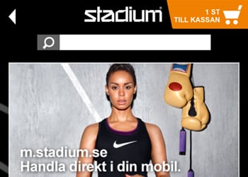 För den som snabbt vill köpa sport- och fritidsartiklar via mobilen. Stadiums mobilsida har ett stort utbud vilket beskrivs med både text och bild på ett enkelt och attraktivt sätt. Den tydliga utformningen på sidan gör det enkelt för kunder att hitta den produkt de söker.
