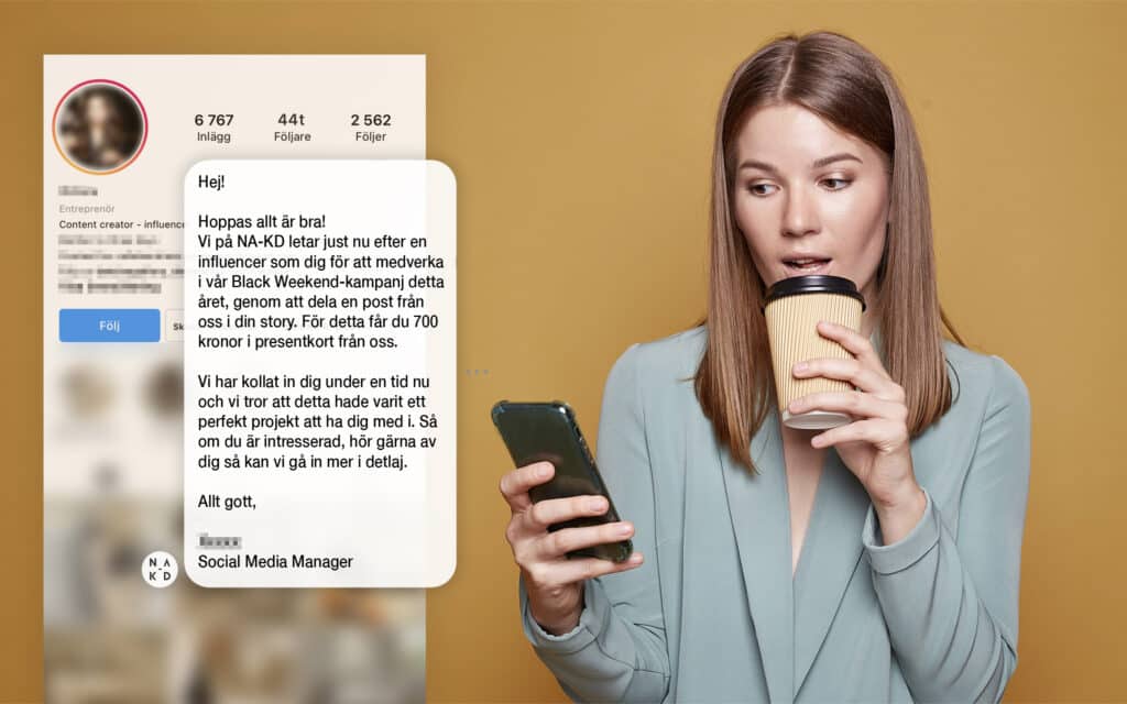 Vi på Na-kd letar just nu efter en influencer som dig för att medverka i vår Black Weekend-kampanj detta året, genom att dela en post från oss i din story. För detta får du 700 kronor i presentkort från oss, skrev företaget i ett meddelande till influencern.