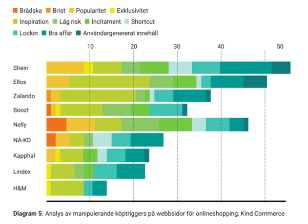 Resultatet visar att alla de granskade företagen använder dessa metoder, men i olika utsträckning. Shein har den högsta frekvensen av köptriggers, tätt följt av Ellos. I andra änden av skalan återfinns H&M, som använder ett mer begränsat antal. Enligt rapporten är det dock inte bara antalet triggers som påverkar, utan även deras placering och visuella utformning.