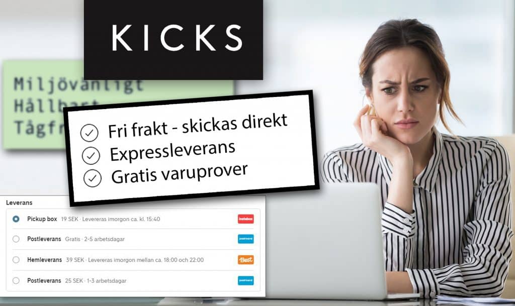 Frågan är dock hur hållbar satsningen var i längden. Snart två år senare kan vi nämligen konstatera att den som nu besöker Kicks e-handelscheckout inte längre möts av ett förifyllt fraktalternativ som lyfter fram vilka fördelar det har för miljön. Faktum är att något alternativ som lyfter fram miljö eller hållbarhet inte ens finns tillgängligt i kassan, åtminstone inte när vi besöker den. Istället är det expressfrakt som lyfts fram på sajten och det förifyllda fraktalternativet är leverans med Instabox dagen efter.